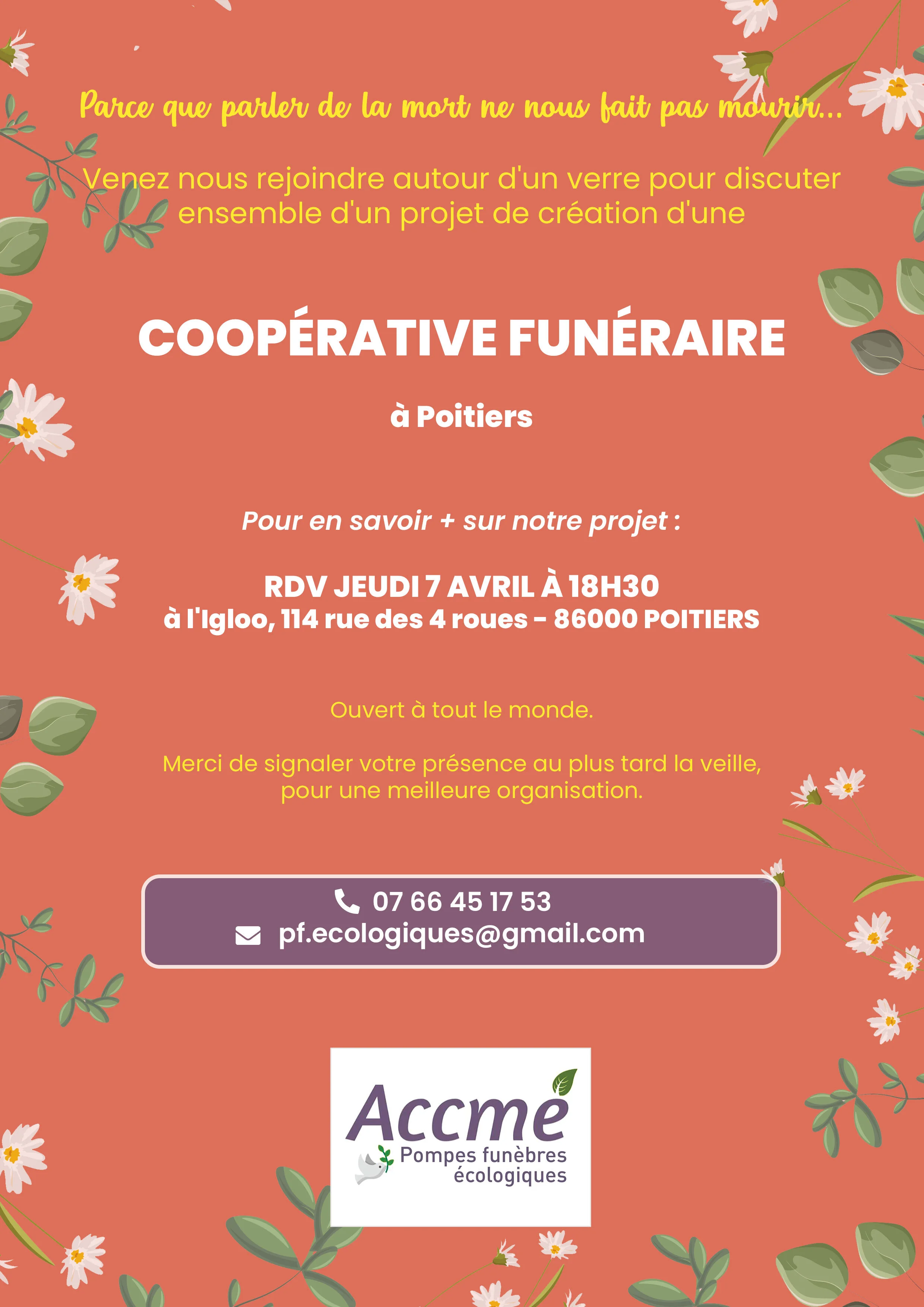 Agnès DIONE 14/03/2024 Agnès DIONE 14/03/2024 ACCMÉ devient Pompes Funèbres Écologiques. Lire la suite